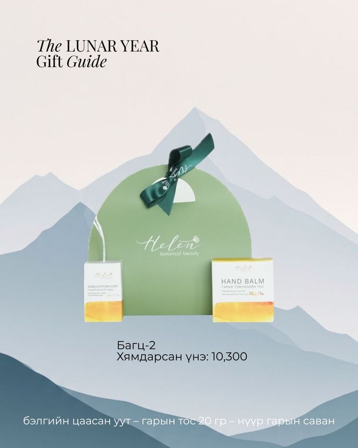 Багцад: 1. Бэлгийн цаасан уут 2. Гарын тэжээлийн тос 20 гр 3. Нүүр, биеийн саван 35 гр